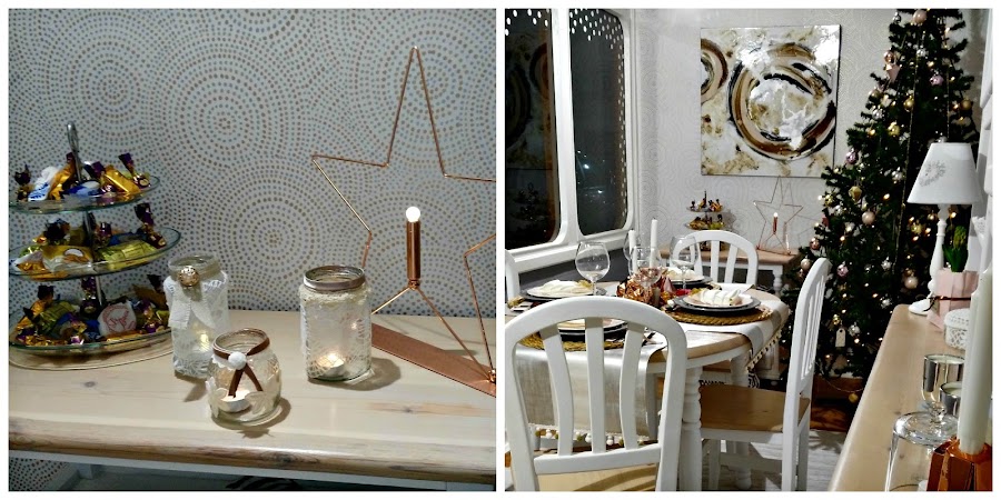 Si el año pasado intenté recrear una sala de estar en la que apeteciera sentarse, con su sillón, su alfombra, su árbol... todo ello en tonos grises, platas y negros, en esta ocasión he optado por darle un aire más cálido con colores como el cobre, la madera o los tonos rosados para recrear un comedor.
