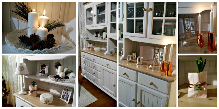 La alacena - también blanca, pero esta vez combinado con madera y más grande que la anterior que teníamos - la hemos aprovechado para "enmarcar" nuestra mesa y, de paso, exponer más cositas de la tienda como portafotos, cajitas, bandejas, otros candelabros, velas ambientadores... ya sabéis, pequeños detalles de esos que dan calor de hogar.