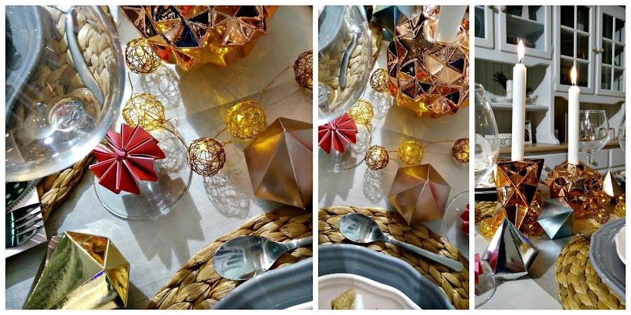 Como centro de mesa, hemos utilizado los candelabros en cobre que acaban de llegar a la tienda - ya os adelanté que serían protagonistas ;) - y, aprovechando sus formas geométricas, los hemos combinados con varios detalles en forma de diamante con varios tonos en la misma gama, y a juego también con la decoración del árbol y el papel pintado de la pared. Para el toque final, hemos incluido una pequeña guirnalda de luces en tonos cobre y, a los pies de nuestra mesa, un alfombra en tonos naturales y beis.