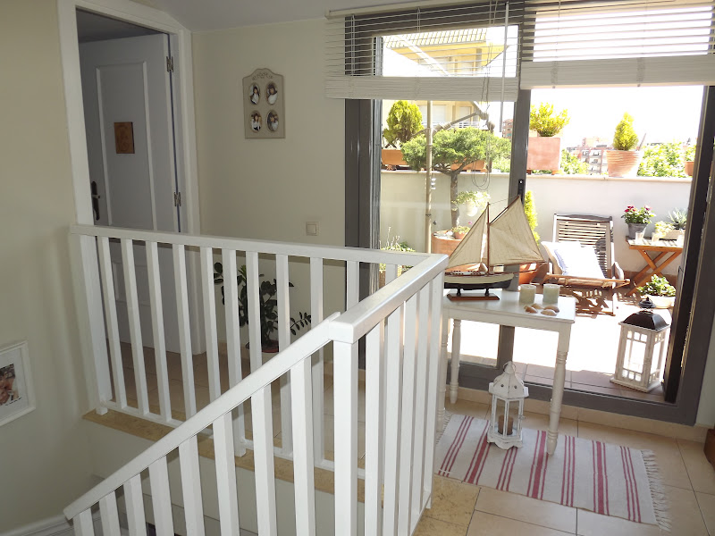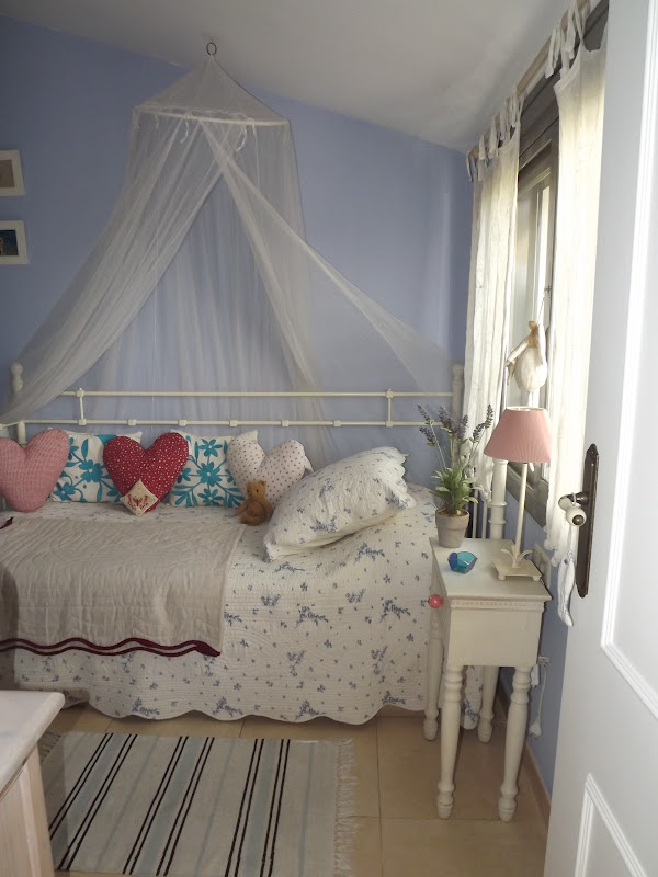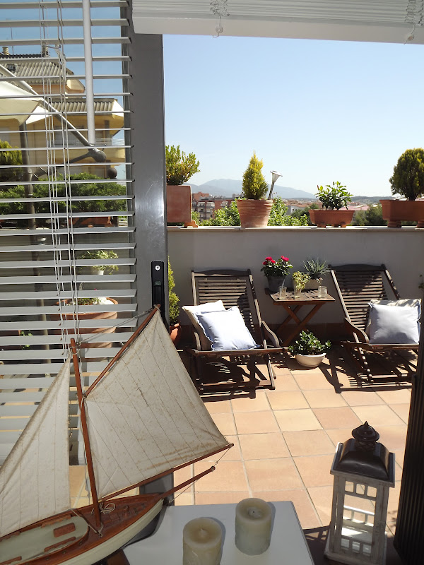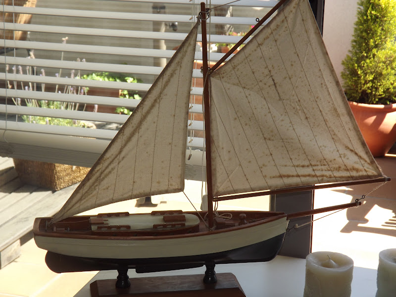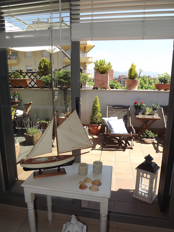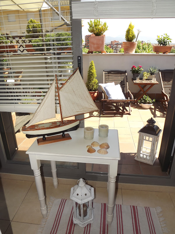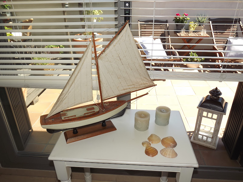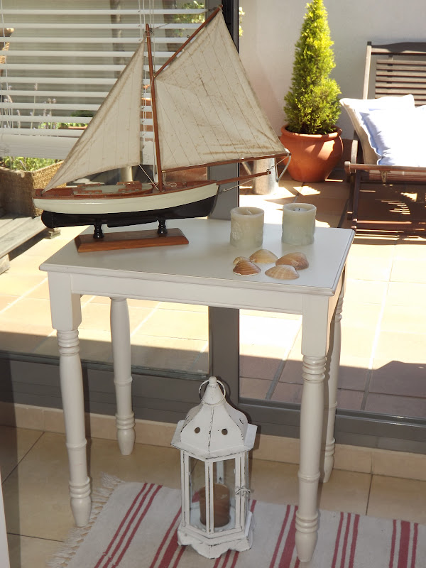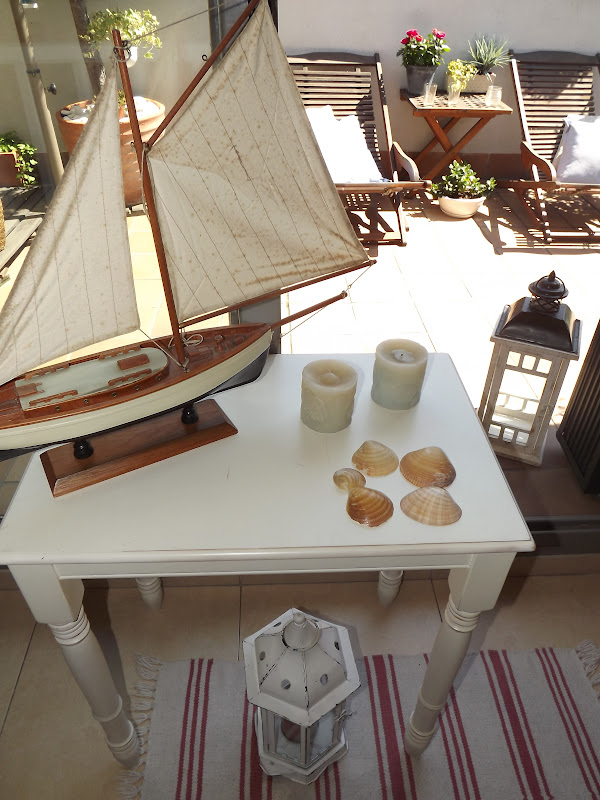 Solo he necesitado una mesita decapada,un barco,velas azules,faroles y conchas de mar...La he colocado delante de la entrada a la terraza con toda la luz que entra,así ella podrá verlo desde su cama...las velas desprenden olor a lavanda y toda la estancia se impregna del dulce aroma.Así de marinera estoy hoy y os deseo desde este rincón un viernes lleno de sol,aroma de lavanda y sensaciones veraniegas...