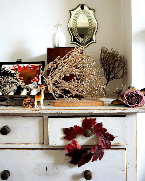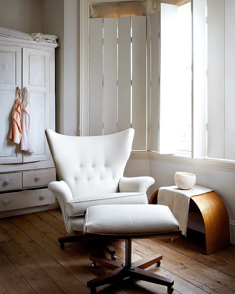 Una reforma en toda regla donde se deshicieron del viejo papel pintado que cubría las paredes y de las viejas alfombras. Tras una buena mano de pintura blanca en toda la casa sólo quedaba darle el toque decorativo adecuado, algo sencillo para una amante de los rastros y mercadillos de antigüedades como Francine. Realiza con gran talento la restauranción de los muebles, creando piezas que rebosan personalidad, como ocurre con la mesa de la cocina. El resultado global de la vivienda es un ambiente de casa viva, llena de contrastes y evolutiva, que cambia según las estaciones del año o el humor de sus dueños.Predominio de la luminosidad conseguida por le blanco de las paredes. Piezas como los sillones y el sofá de corte clásico amueblan un salón rejuvenecido gracias al forrado con una tela vistosa y cubiertos de cojines, hechos por la propietaria con diferentes telas vintage. En este ambiente, la original chimenea se integra perfectamente en la estancia. En la amplia cocina destacan la gran superficie de trabajo de madera de roble y los electrodomésticos, ocultos tras unas cortinas. Para tener la vajilla de diario a mano se colocan unos originales estantes pintados de blanco. Bajo ellos, un pupitre de los años 50′ se recicló en un práctico mueble, en cuyo hueco se instaló el frigorífico, oculto tras una cortinilla. La zona de almacenamiento se habilitó en una amplia despensa situada bajo las escaleras: ¡¡tan vintage!!