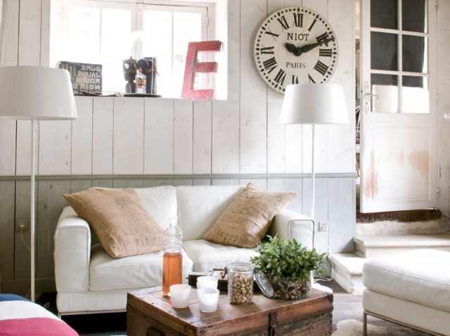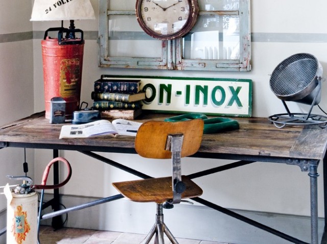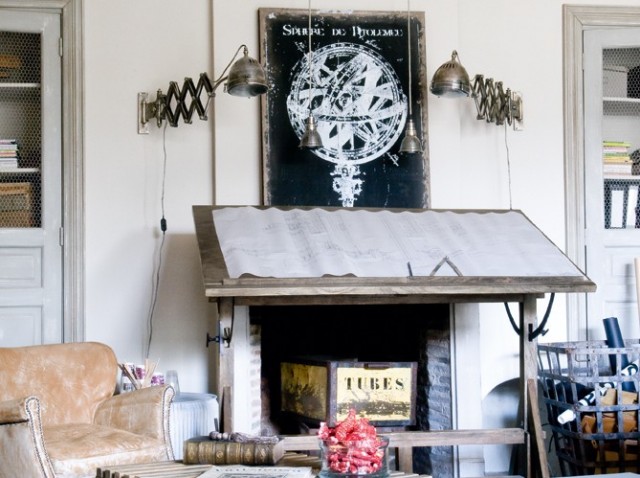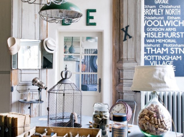 En el salón, bajo el entrevigado de madera teñida en blanco, se combinan la artesanía de la zona con el estilo contemporáneo del reciclaje. En la cocina, todo está cuidadosamente almacenado en los armarios hechos a modo de nichos. Muebles sencillos vestidos y pintados con tableros personalizados. La zona de trabajo es de hormigón pulido y las suspensiones (lámparas) fueron creadas por la propia Sophie, siguiendo un esquema muy industrial de iluminación de fábrica. La estufa Lacanche, las sillas Tolix, la mesa con sobre de madera y hierro y los accesorios industriales, son un reflejo claro de la pasión por todo lo industrial-vintage de su dueña.