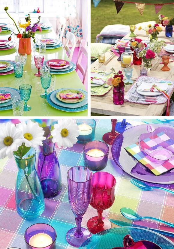 Los colores transmiten alegría, y ahora en verano, una mesa colorida es éxito seguro entre tus invitados. Combina colores tanto en platos como en vasos y copas. No tengas miedo a combinar distintas vajillas, en este caso se busca dinamismo y espontaneidad, por lo que no temas hacer mezclas de colores, formas y texturas. Para no saturar, recomendamos una base neutra que rebaje la intensidad del conjunto.