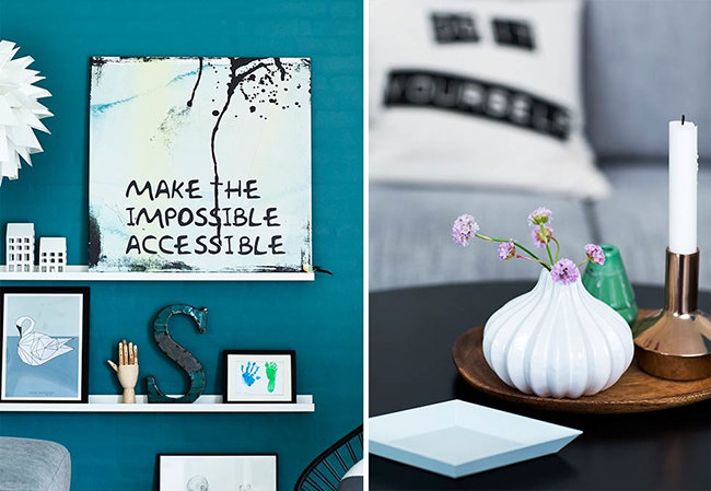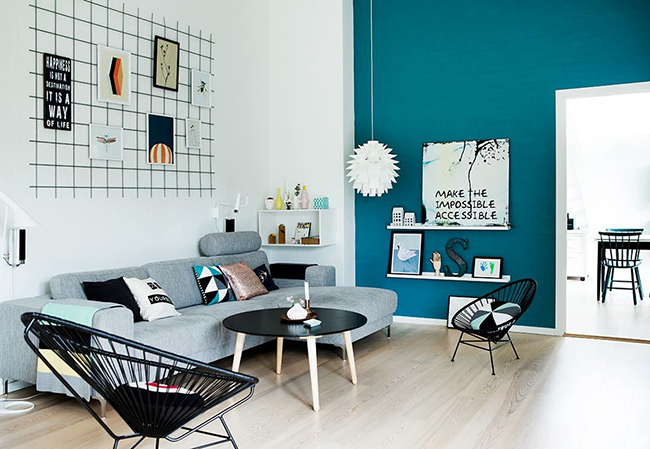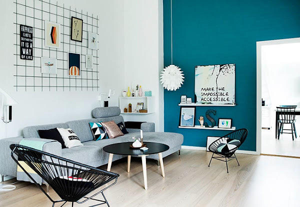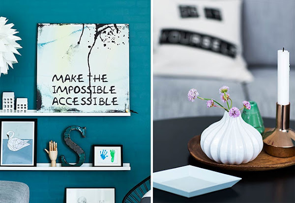 No sé vosotros pero yo siempre he pensado que los colores fomentan muchísimo la creatividad y la fantasía, en mi casa vamos a rachas pero siempre al llegar esta época nos da por cambiar a tonos mas oscuros que combinamos con los socorridos neutros (blancos, grises, arenas...), pero este año quiero pasarme al lado COLOR darle un toque diferente para alargar lo que ya es inevitable... EL FIN DEL VERANO. Fue así como se me ocurrió buscar algo de inspiración un poco diferente, una casa con colores más oscuros que me trasmitiera que el otoño había llegado, turquesas, negros, grises y mostaza... se cuela algún burdeos pero en muy pequeña escala y éste ha sido el resultado.