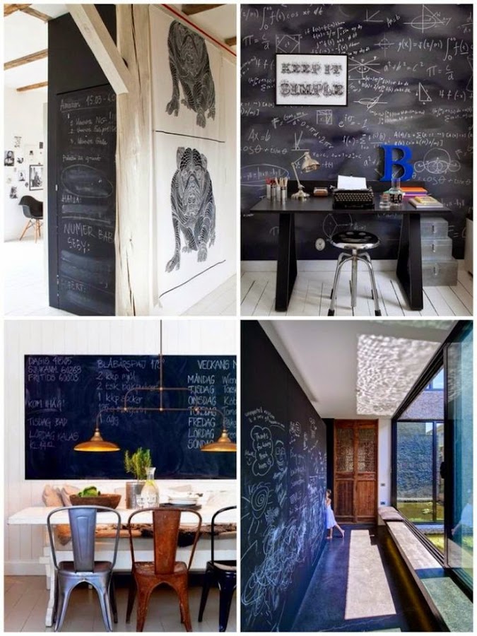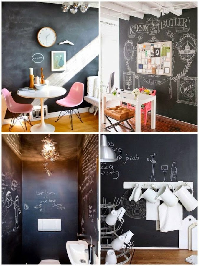 La pintura pizarra nos da mucho juego ya que podemos pintar una pared, una puerta o incluso un mueble, no recomiendo que sea una gran superficie ya que al ser tan oscuro puede hacer el espacio más pequeño. Lo más divertido es el poder cambiar continuamente los dibujos o textos que hagas. Y como todo se moderniza, ya no tienes que ensuciar con tizas ya que existen rotuladores tizas de colores mucho más prácticos.
