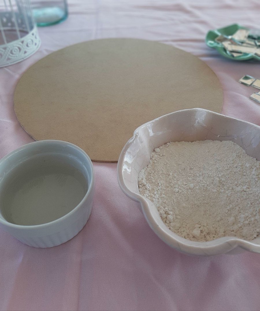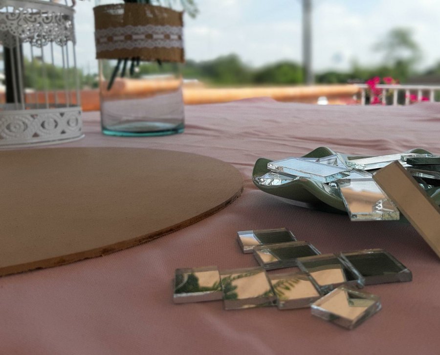 Se distribuyen la mezcla del yeso por toda la base rellenando los espacios entre los espejos, limpiamos bien con un trapo húmedo para que los sobrantes no se sequen sobre el espejo, y dejamos secar durante dos horas. Cuando este saco pasamos un trapo seco para que los espejos nos queden bien limpios
