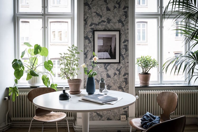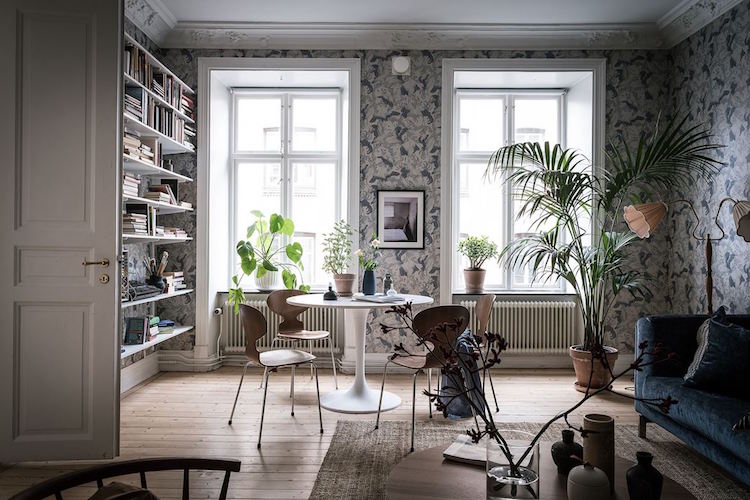 La zona más oscura y marcada de la vivienda, es el salón y lo que parece el hall. En ambos sus paredes están cubiertas por un precioso papel de flores. La librería del salón está formada por unas sencillas y ligeras baldas, en color blanco, como la mesa del comedor y en cambio a un lado se alza el sofá terciopelo en un actual color navy peony, y sí es la zona más oscura de la casa, pero sería una gozada arrebujarte ahí a leer un buen libro ¿No creéis?