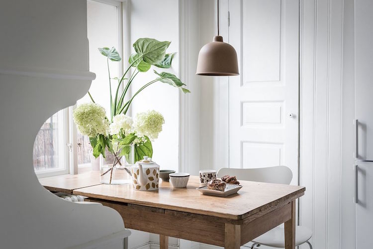 Creo que al final es inevitable enamorarse de esta casa, cada vez me gustan los marcados alfeizar de las ventanas con su clásico sobre de mármol donde apoyar decorativas macetas con plantas diversas. La cocina, por ejemplo es un espectáculo: Tan blanca, con ¡esa mesa! y las hortensias dando vida al espacio.
