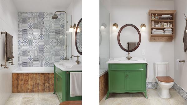 Como remate, un baño muy de estilo clásico francés, con azulejos de mosaico, con un mueble bajo lavabo verde barco y los detalles combinados en una cálida madera: La tapa del WC, el lateral de la bañera, la estantería sobre el inodoro.