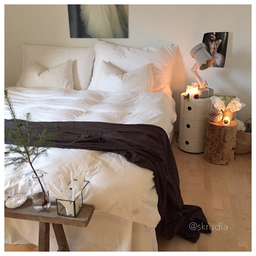 La habitación principal tiene un estilo Nórdico Natural. EL rincón con tronco + mesita de noche + lampara de cartón, me encanta. Igual que el banco de madera natural a los pies de la cama.