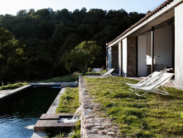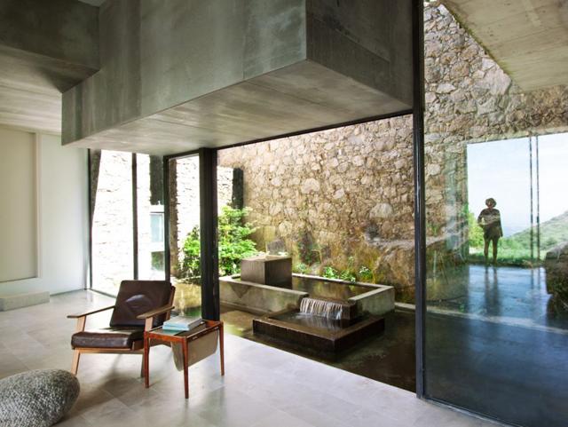El gran descubrimiento fue hallar un manantial subterráneo que se ha convertido en una fuente del patio interior, y como recurso natural para la casa en los meses de verano, ya que corre bajo la construcción hasta llegar al río, creando así una especie de suelo radiante de efecto frío.