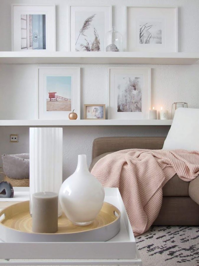 Decorar con láminas es un recurso tan decorativo como económico, por eso cuando decoré mi salón por primera vez no me lo pensé dos veces y dispuse algunas fotografías y un par de láminas de frases sobre los estantes que tenemos junto al sofá.