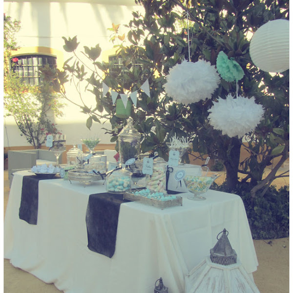 La decoración no ha podido gustarme mas, con los pompones de papel y los banderines con las iniciales de los novios, todo lleno de bomboneras de cristal, bandejas de plata y el toque de los faroles XXL de La Indiana Colonial