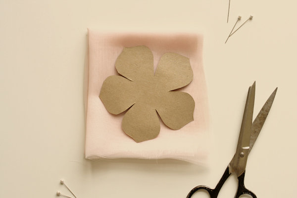 2º Doblamos la gasa en tantas capas como queramos para la flor y ponemos la flor de cartón encima, agárralo con unos alfileres y recórtalo: