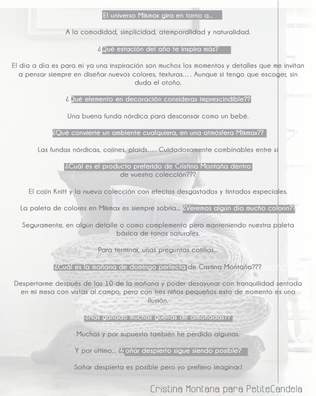 Para los que no conozcan la marca, lo primero es decir que su diseñadora, Cristina Montaña, vive y crea todo el universo Mikmax desde su refugio particular. Mamá de tres hijos, busca inspiración en su entorno para acabar diseñando unos textiles amorosos y de esos que crean hogar. Las fotos de sus ambientes nos cuentan exactamente de qué va lo que ellos hacen: trocitos de casa llenos de almohadones, cojines, calidez y ambiente tranquilo. Y es que quizá, lo que más nos gusta de ellos, es que con una paleta de colores muy básica, tocando blancos, grises en todos sus matices, consiguen a través de las texturas, un producto que apetece. Que se adivina muuuuy confortable, no os parece??