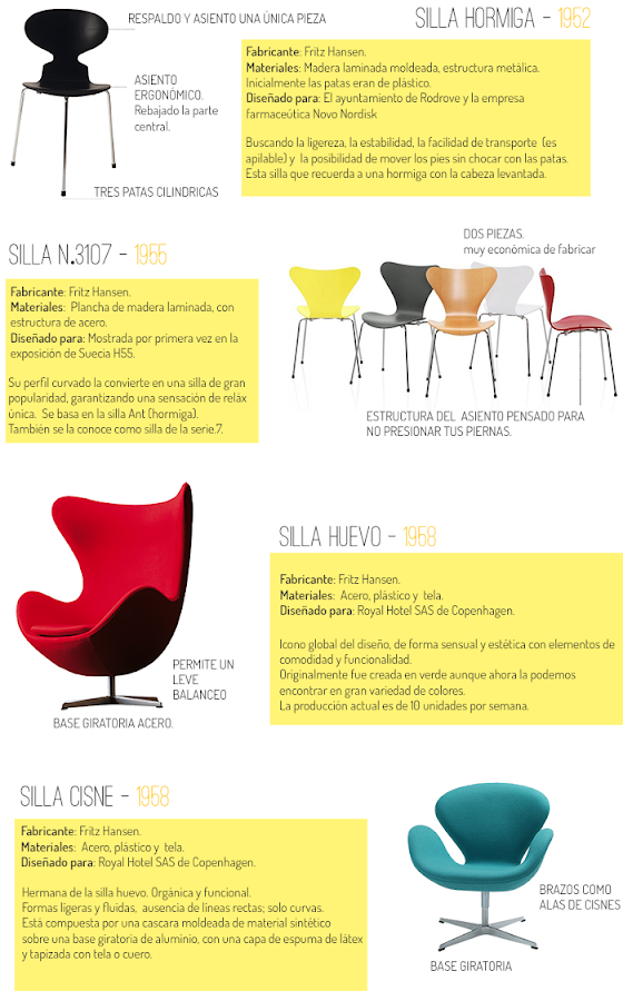 En 1934 el arquitecto empezó a cooperar con la fábrica Fritz Hansen, la cual sigue fabricando sus diseños hoy en día. El éxito del mobiliario de Jacobsen junto a Fritz empezó junto a la presentación de la Silla Hormiga, en 1952.