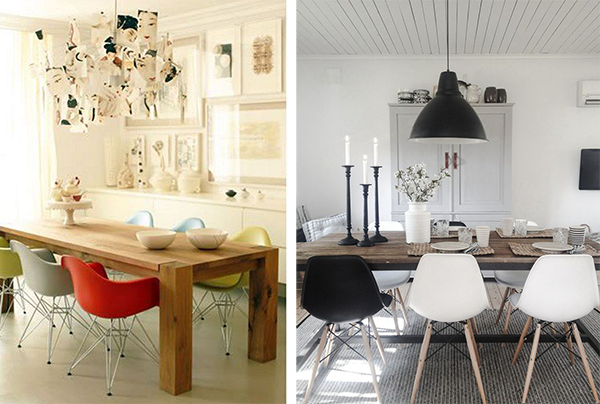 Seguro que no os digo nada nuevo al deciros lo mucho que me gustan las sillas de los Eames, y no me quedaré contenta hasta que no las tenga en mi comedor, jejeje, así que me toca ahorrar y pensar si las quiero en blanco o en color y ahí va mi primera pregunta: ¿cómo las pongo: en blanco, negro o cada una de un tipo?