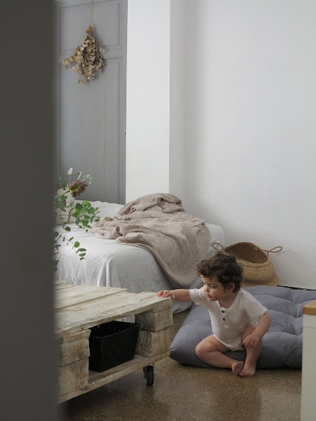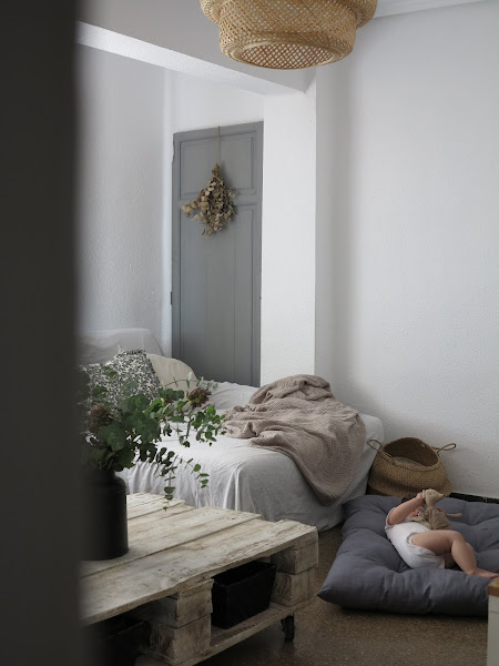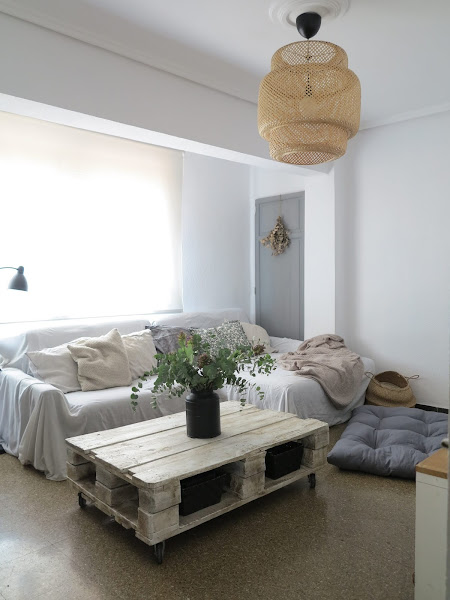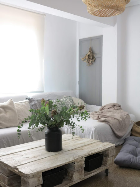 Me encanta cuando llega el cambio de estación, aunque me encanta el frió y ver la casa con cojines de punto y mantas, la luz que entra cuando llega el buen tiempo no tiene competencia. Para aligerar la zona del sofá he optado por añadir nuevos cojines en lino en colores claros para dar luminosidad, una mantita en tejido muselina porque nosotros siempre nos tapamos, pero este es un tejido mucho mas ligero, perfecto para esas noches de verano que refresca un poco. Todos los textiles son de Hym Home. Como pieza estrella nunca pueden faltar las flores. Como me da tanta pena que duren tan poco los ramos, encontré estas flores artificiales en la tienda casa, tenían un aire campestre, así que me vino la idea de juntarlas con eucalipto para disimularlas y tener un ramo mucho mas tiempo, como sabéis el eucalipto una vez seco tarda bastante en ponerse feo, por lo que luego siempre podemos ir renovando el ramo de una forma económica.