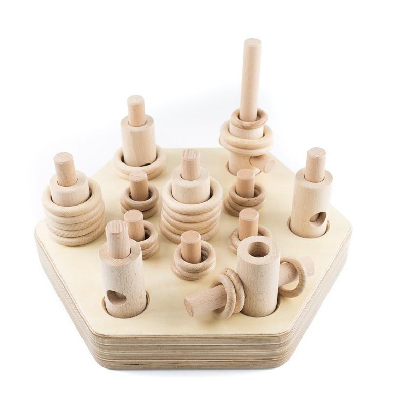Hexágono con cilindros y anillas: este lo tienen en la escoleta de Valentina y es un éxito rotundo. Se trata de una base hexagonal de madera con agujeros de dos diámetros distintos, 21 anillas pequeñas, 14 anillas grandes, 7 cilindros cortos, 7 cilindros largos y 7 cilindros doblemente perforados (vertical y horizontalmente).. ¡Y todas las piezas combinables entre sí! Es un fantástico juego de manipulación, encaje y descubrimiento, muy muy completo. Es un juego abierto, no estructurado, versátil y de calidad. Combina el juego heurístico con la invitación a la manipulación y la construcción. Además los materiales son robustos y cálidos a la vez. El hexágono está barnizado con productos aptos para el uso infantil y viene con una bolsita para tenerlo todo recogido. Lo podéis encontrar aquí.