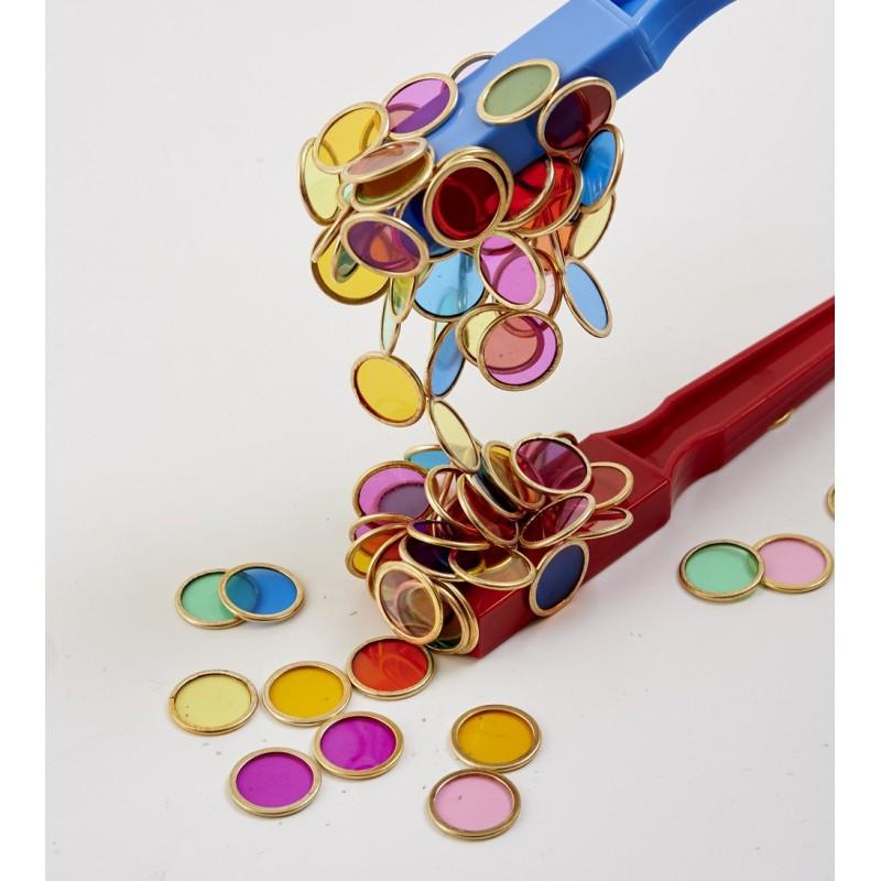 Varitas magnéticas y círculos translúcidos: ¡ideal para la mesa de luz! Son dos varitas “mágico-magnéticas” que atraen objetos hacia ellas combinadas con los 100 círculos translúcidos de borde metálico. Tened en cuenta que los círculos son muy pequeños, apenas 2 centímetros con lo que tienen que ser para niños que hayan superado ya la fase oral y yo como consejo (y más ahora teniendo una bebé) son materiales que no tendría a su alcance y que los ofrecería siempre para jugar juntos. Lo podéis encontrar aquí.