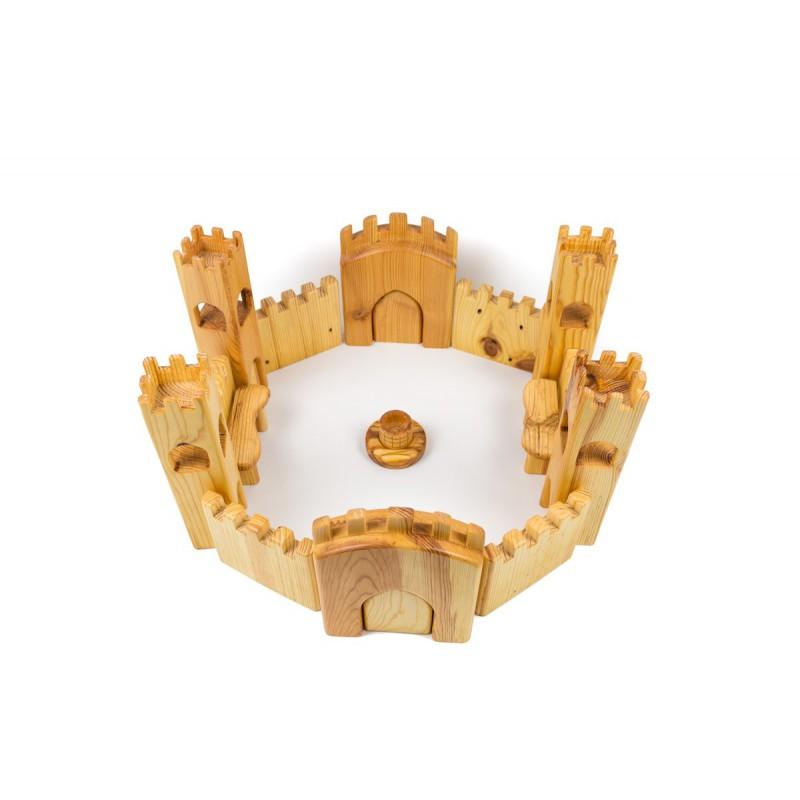 Gran castillo de madera: son 22 piezas de madera natural para construir tu auténtico castillo de juguete. Lo componen torres altas, paredes gruesas, puertas macizas, un par de bancos e incluso ¡un pozo! Puede convertirse en una fortaleza, un castillo cerrado,… ¡el diseño corre de tu parte! Un total de 22 piezas para poder construir un castillo de juguete modular, 4 torres de vigilancia con puerta, 6 paredes, 2 arcos de entrada con puerta, 2 bancos y un pozo. Lo podéis encontrar aquí.