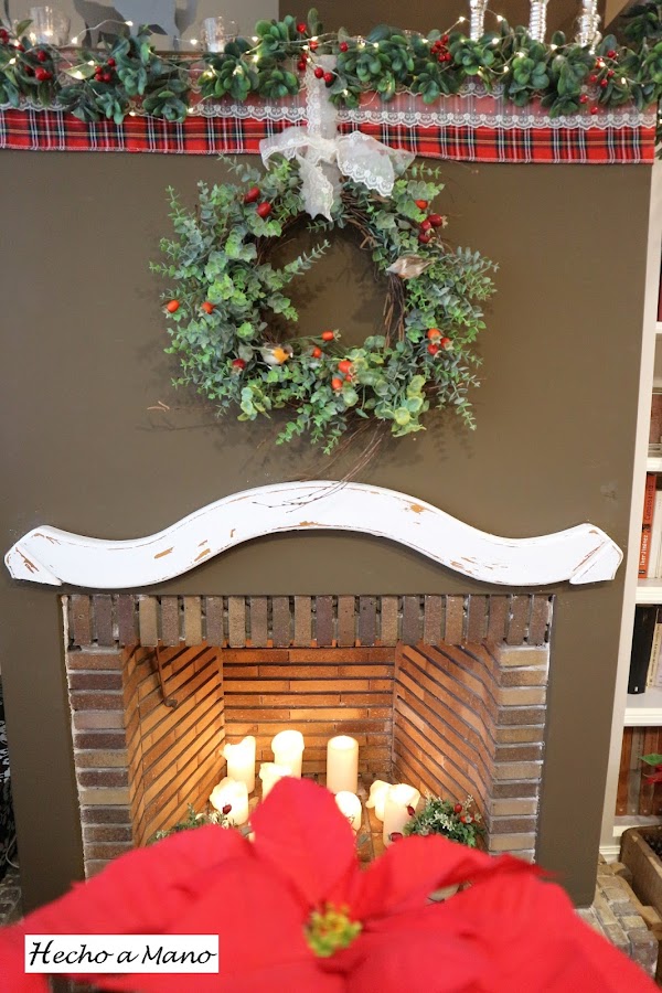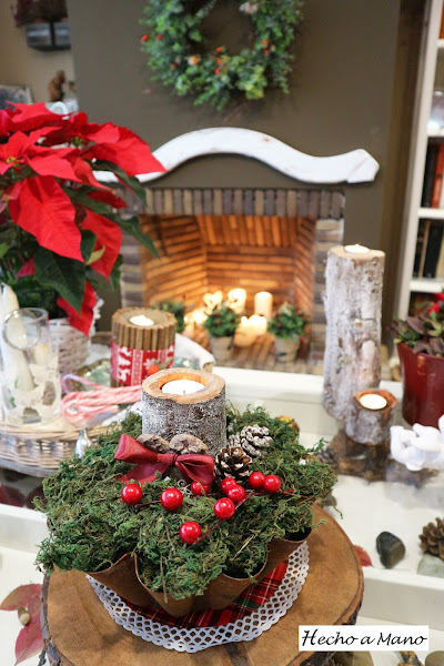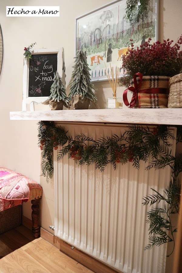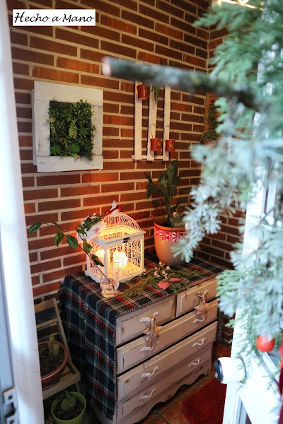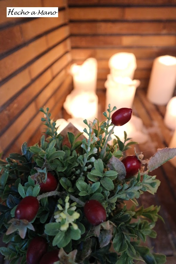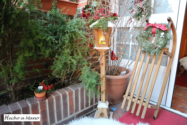 Un antiguo trineo que he conseguido en un mercado de antigüedades, y que dicho sea de paso me tiene enamorada, alberga una corona muy sencilla de ramas también naturales, junto a mi pequeña farola.