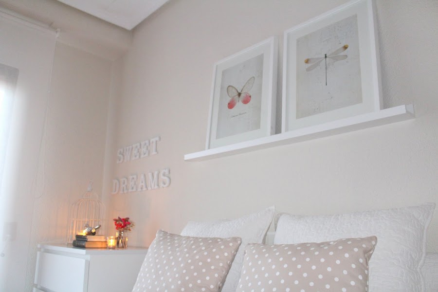 Seguimos con la misma gama de pintura, Nepal beig suave y beig natural de Bruguer,pusimos el taburete escalera Bekväm de Ikea y la cómoda Malm de 3 cajones a modo de mesillas para ganar almacenaje y como cabecero añadimos una balda de cuadros Ribba y dos marcos.