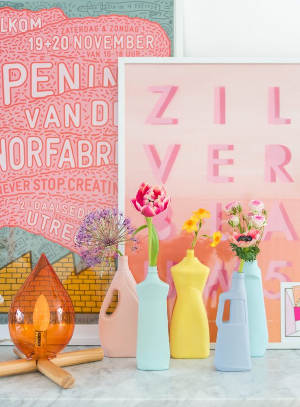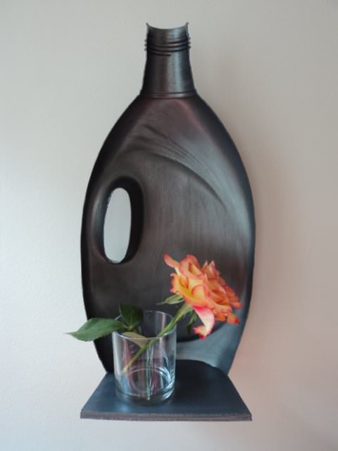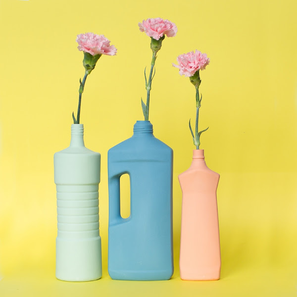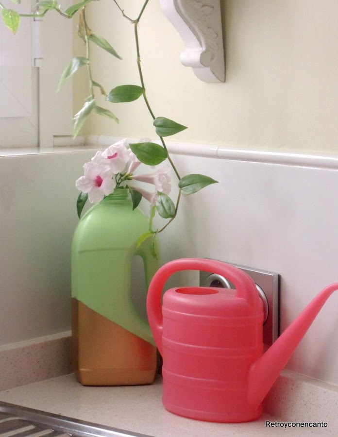 Y fue al ver esta bella botella de detergente de su colección, que no pudimos evitar asociarla a la que redecoramos hace poco (¡salvando las distancias, Dios nos libre!), no solo por el objeto en sí, sino, y sobre todo, por el mismo sentimiento de no tirar y reutilizar latente, y encima, de la forma más decorativa posible... Faltaría más.
