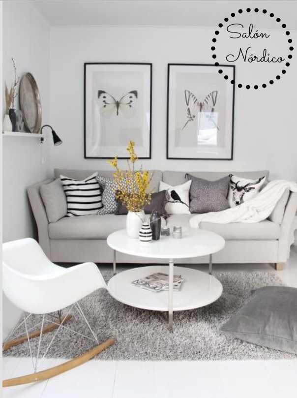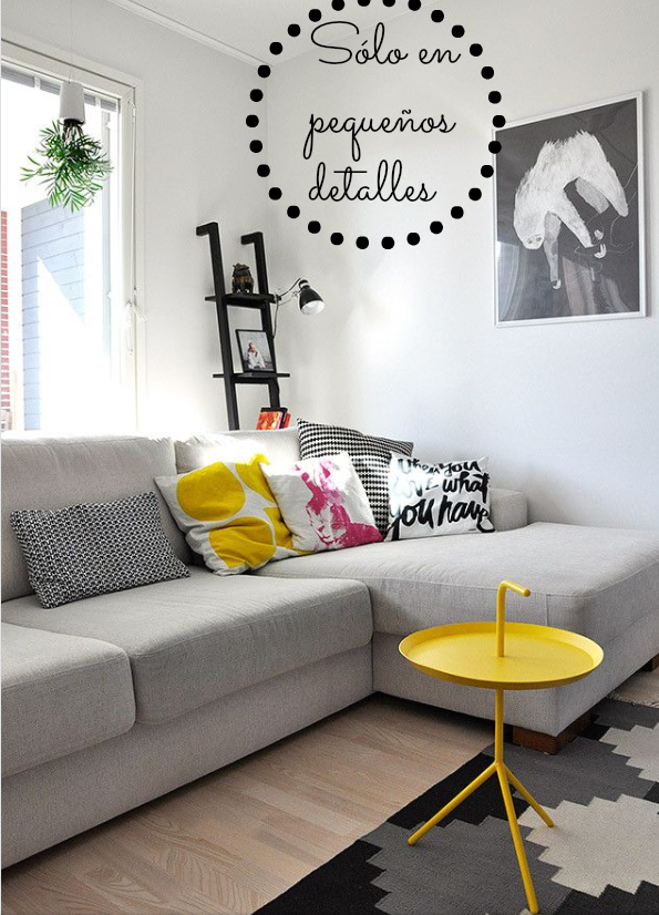 Este saloncito para mí es perfecto...luminoso, acogedor, cálido, nórdico, gris+blanco y detalles en amarillo....