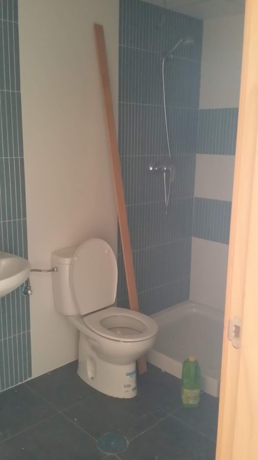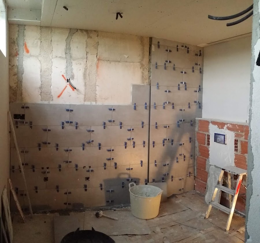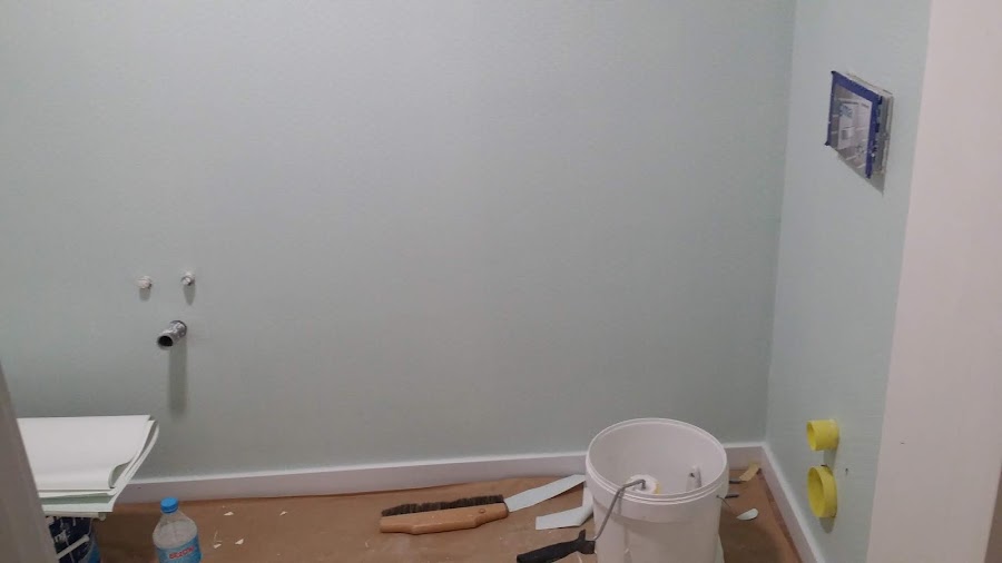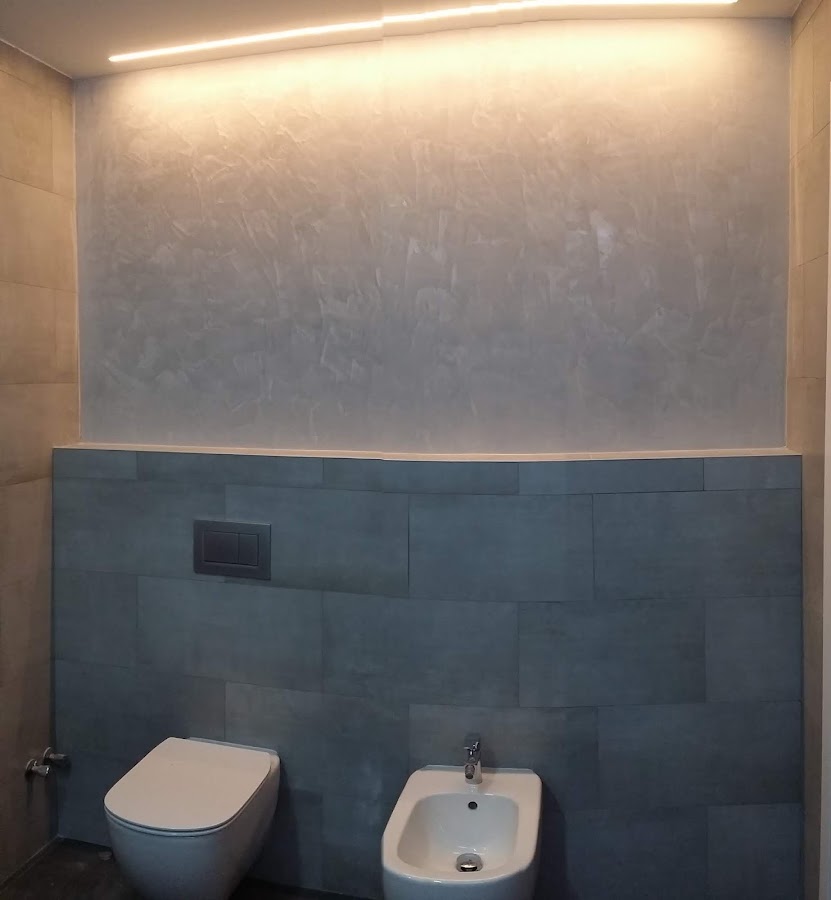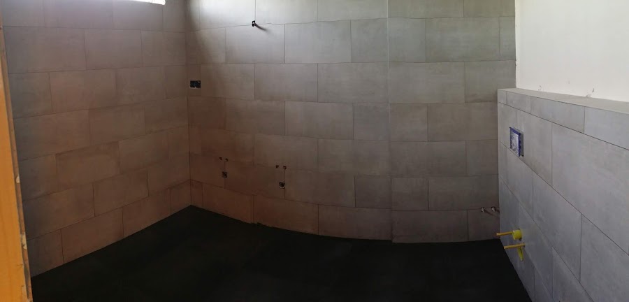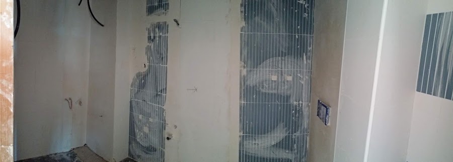 Empapelado vinilico en baño cortesía tras enmasillado de azulejos.