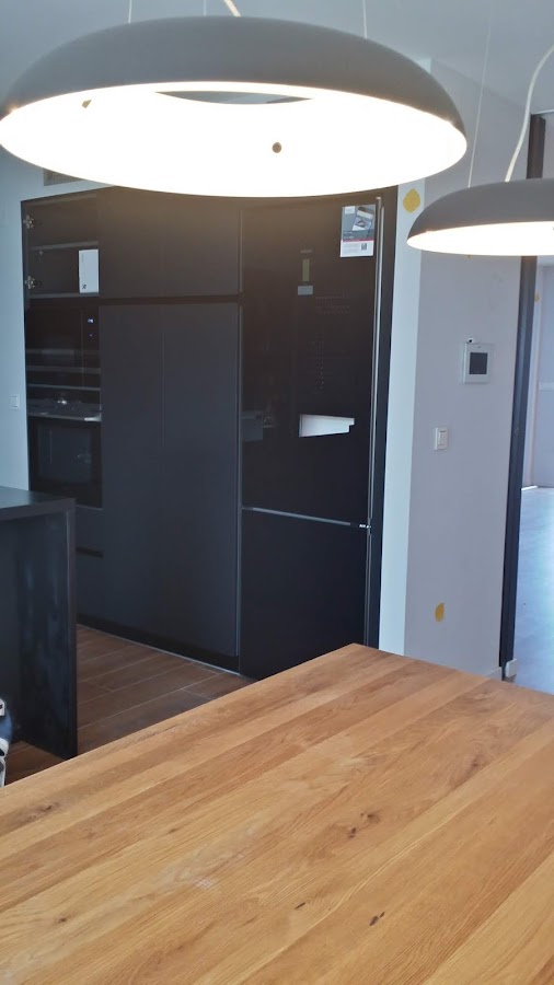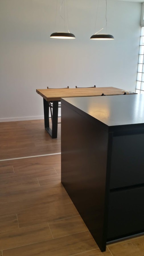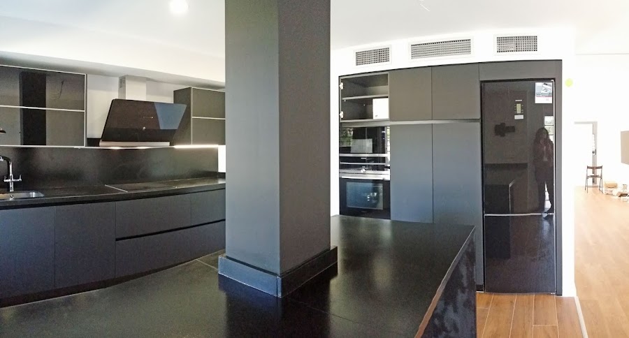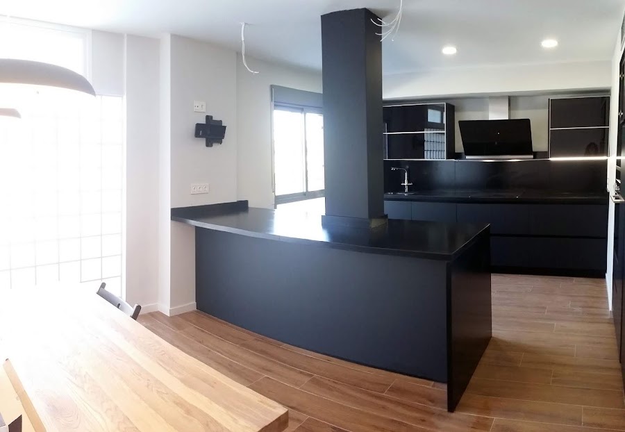 Acabado negro en hueco electrodomésticos y pilar en pintura de pizarra.