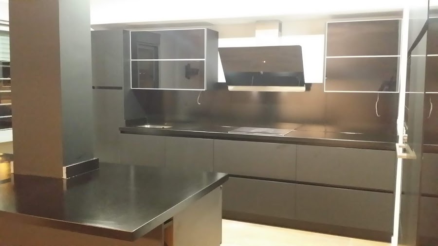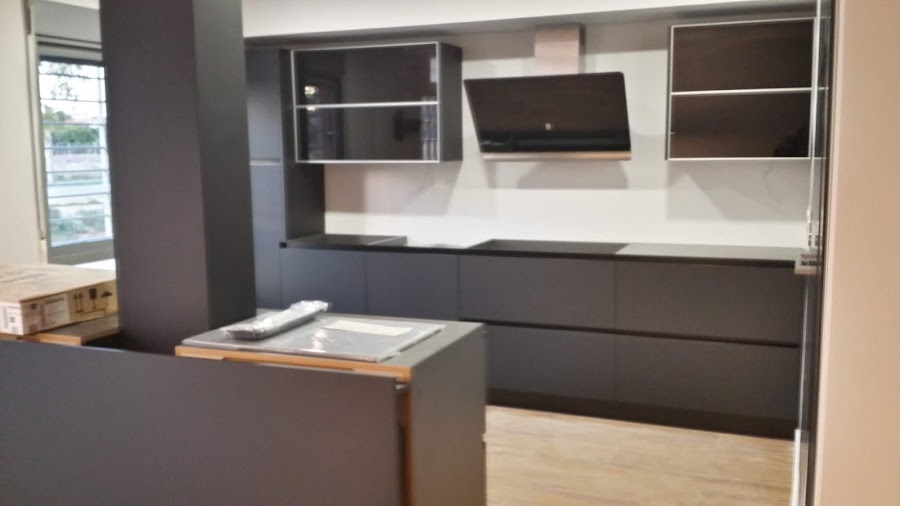 Instalación de cocina en acabado negro mate anti huellas, gola y rodapié en aluminio negro.