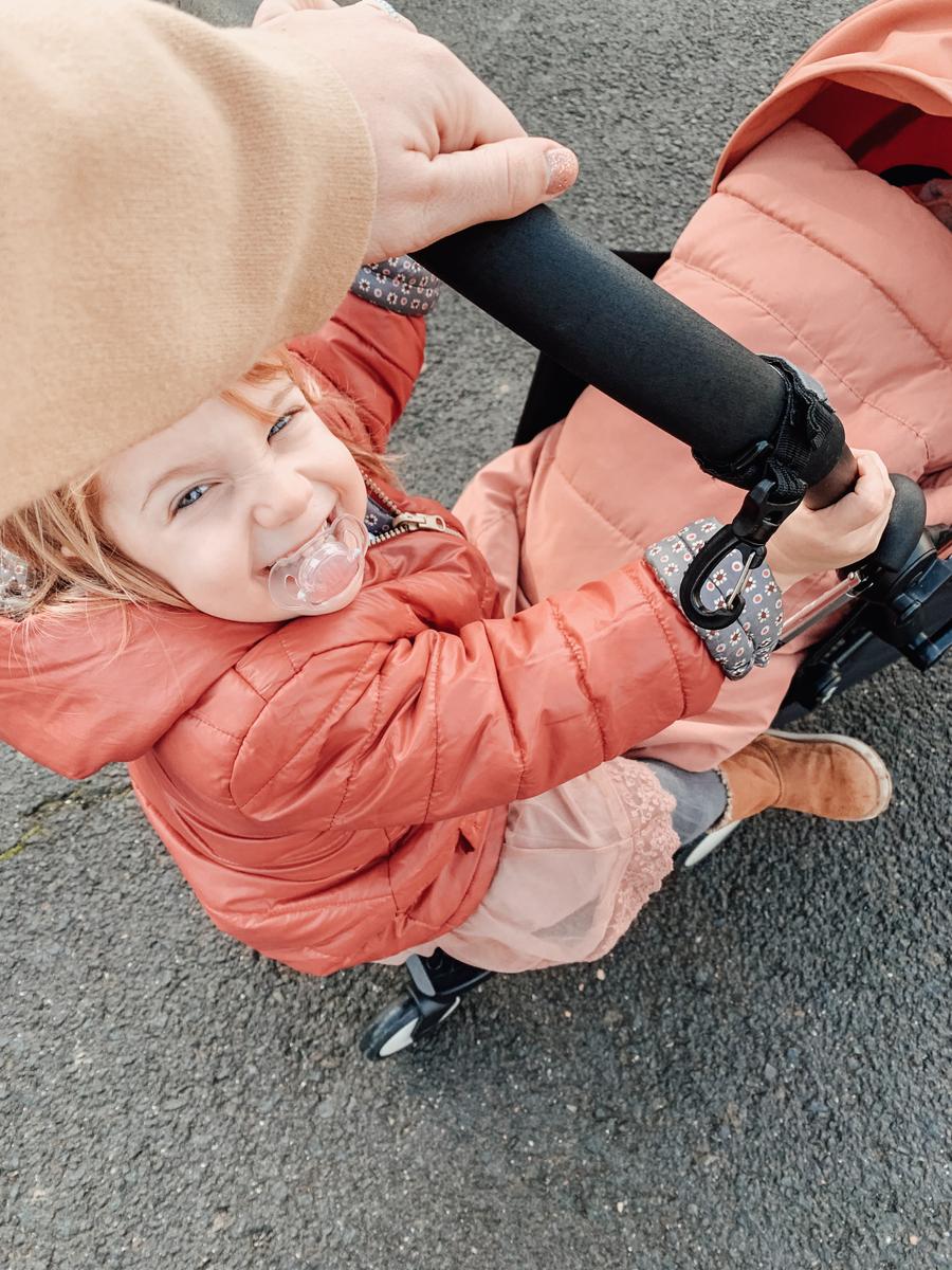 Patinete para herman@: Tengo que reconocer que al principio me daba reparo, ya que es innegable que no es lo más cómodo del mundo para pasear cuando tienes un patinete entre el carrito y tú. Pero en la practica a mi me ha resultado la mejor combinación cuando voy sola con las dos y quiero ir combinando quién está sentada en el carrito. Hay veces que va Julieta y Valentina en el patinete, hay veces que va Valentina sentada y Julieta porteada… Y en esos casos recojo el patinete con las cintas y no me molesta para nada. Sería algo que recomendaría a todas las que os estrenéis como bimadres.