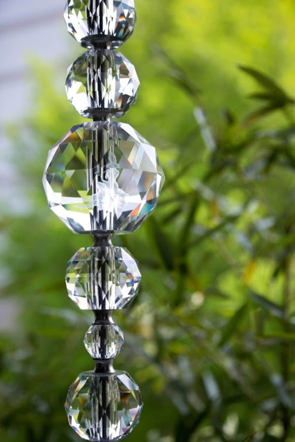 El efecto de las cuentas de cristal junto a los bambús, me parece muy poético, ya que da todo tipo de reflejos de colores al reflectar la luz del sol.